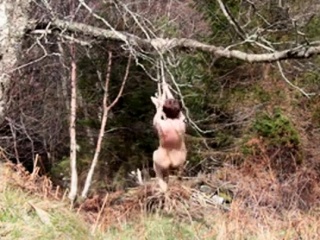 Naked self-bondage in the woods gone wrong.