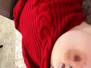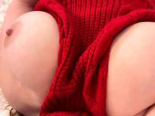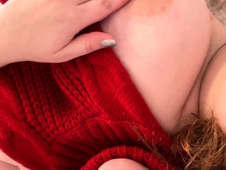 Busty curly brunette with big boobs fucks on couch