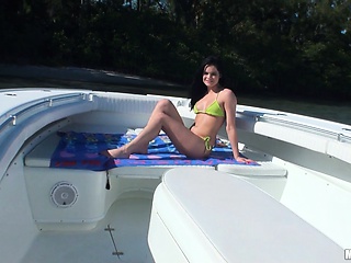 She climbs aboard the boat and oils up her ass so he has something to play with
