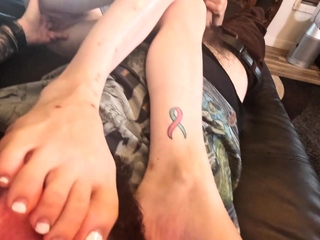 Brunette with foot fetish rubs big dick with her feet in POV