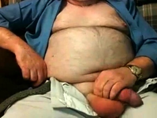 Hairy stud sits on the couch stroking his big shaft to pleasure